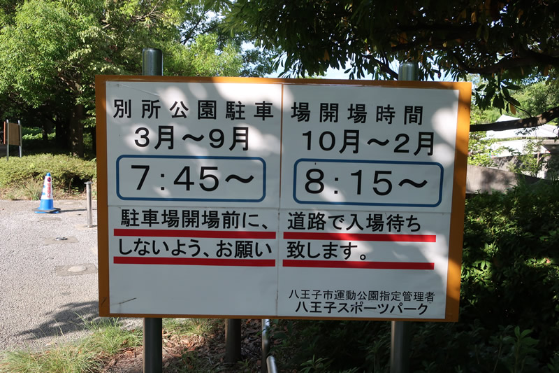 別所公園の駐車場の看板です。夏と冬で開場時間が違います。奥の方にテニスコートがあります。