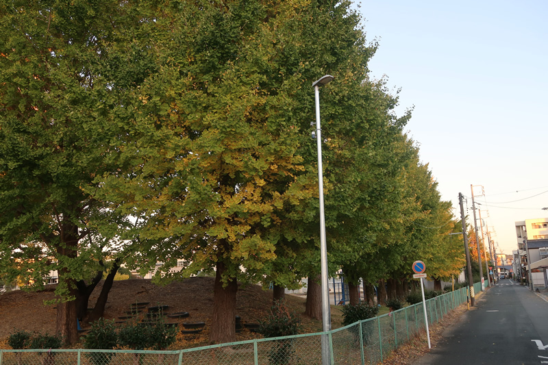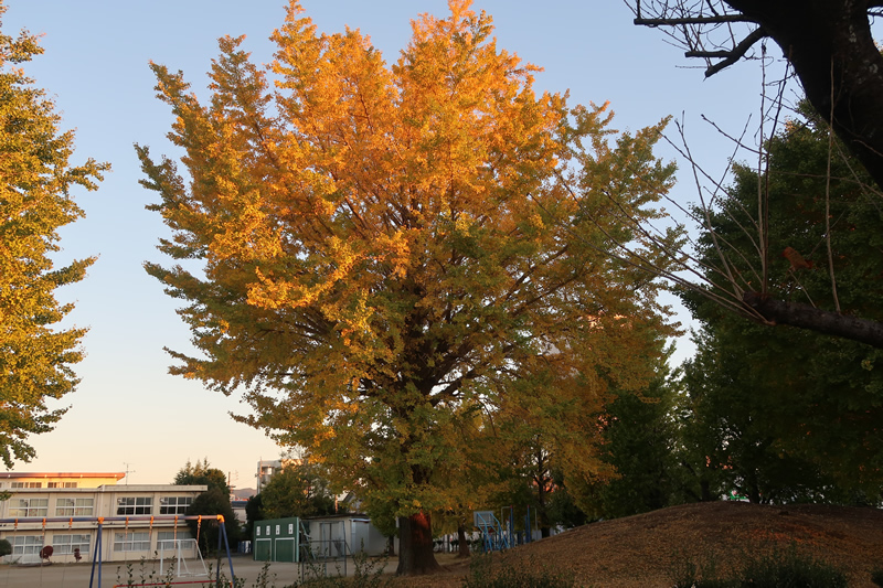 右のイチョウの木の陰になる部分は緑色の葉もあります。