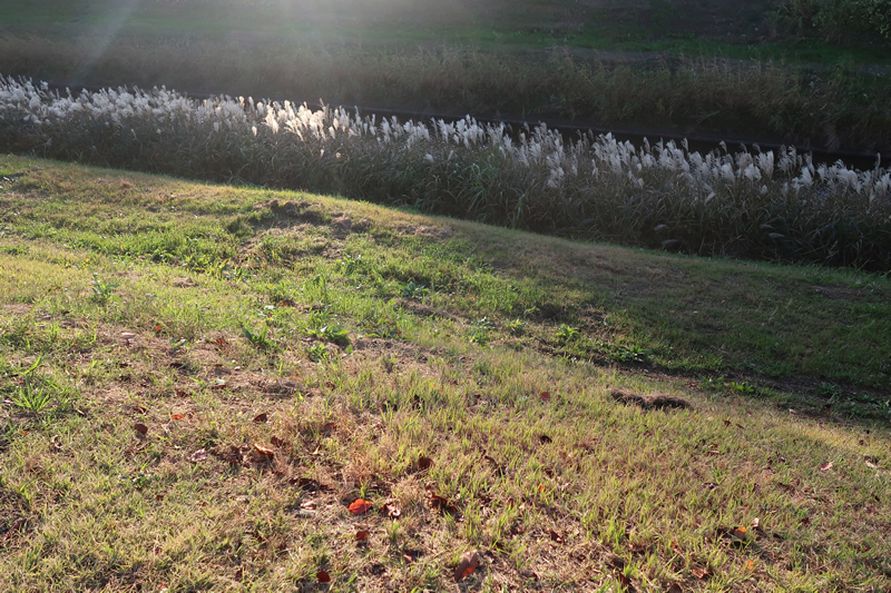 中部小学校のイチョウの木の南側を流れる佐奈川の土手にイチョウの葉が積もっています。