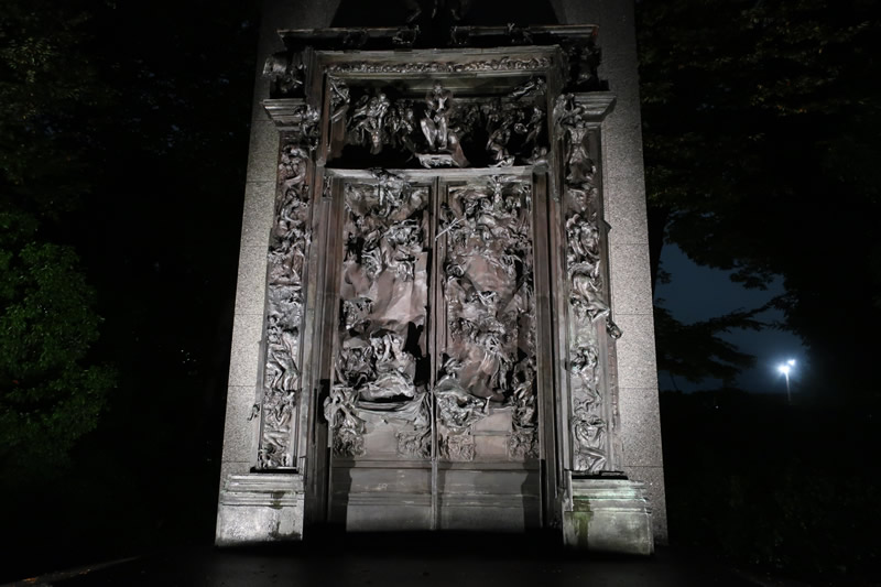 オーギュスト・ロダンの未完の作品に、ダンテの「地獄の門」をテーマとして制作された、巨大なブロンズ像『地獄の門』がある。夜に撮影したので、不気味な感じがします。