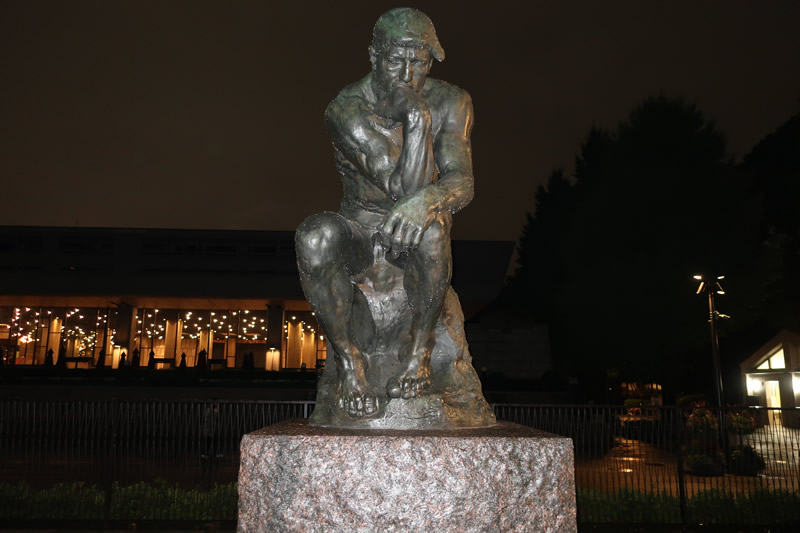 「考える人」はこの地獄の門を構成する群像の一つとして造られたもので、単体作品としても独立して高く評価されている。雨粒が考える人の表面に付いています。雨が降ってもずっとこのまま考えているのです。