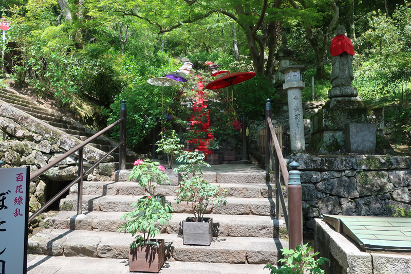 ここは、階段に毛氈が敷かれて牡丹の鉢植えが咲いています。